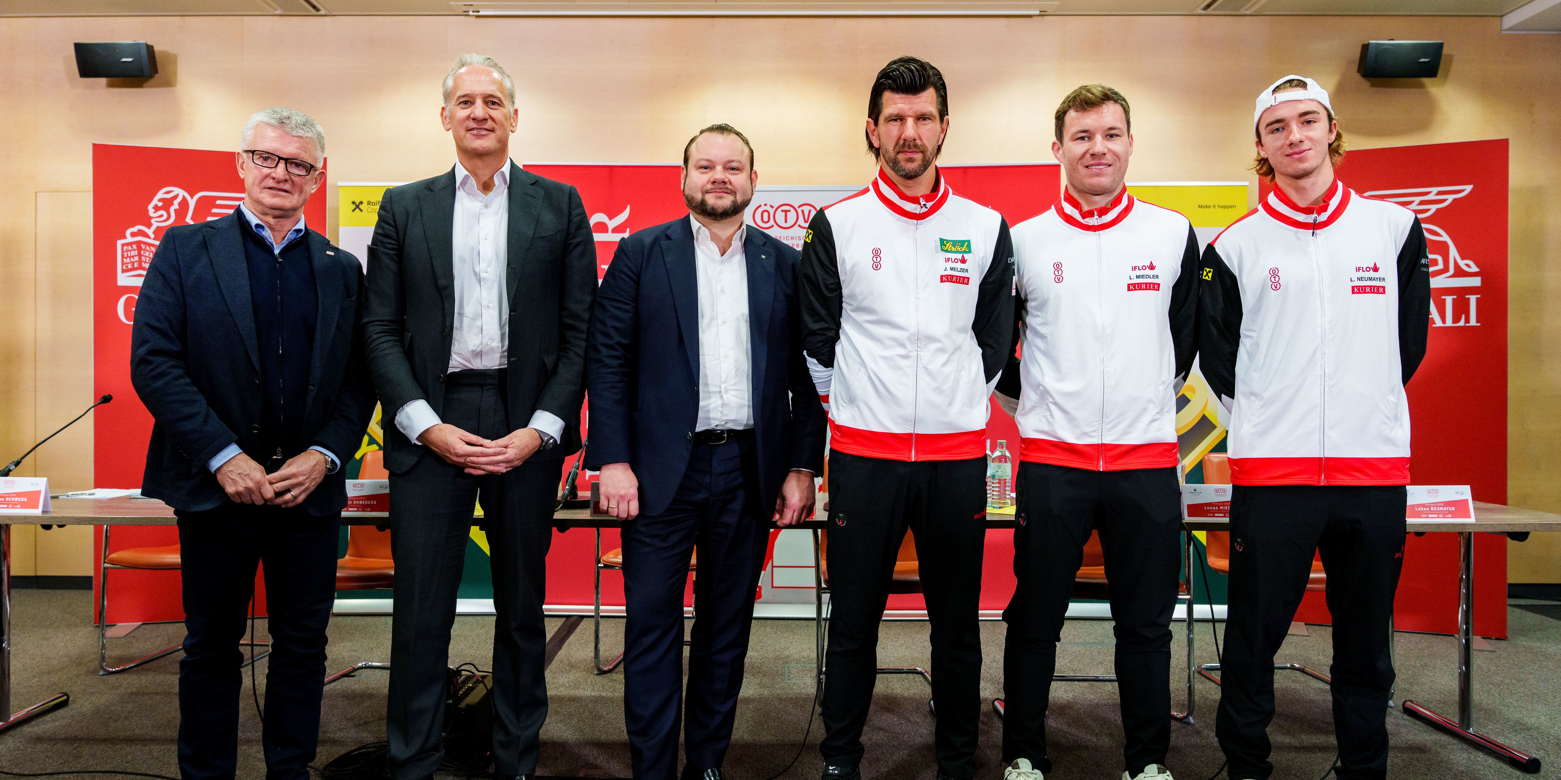 Auf geht’s nach Bologna! Einen Tag vor der Abreise zu den Davis Cup Final 8 (18. bis 23. November), wo Österreich im Viertelfinale am Mittwoch um 16:00 Uhr (live auf ORF 1) der zweimalige Titelverteidiger und Gastgeber Italien erwartet, hat sich das KURIER Austria Davis Cup Team am Freitag nochmals allen Fragen der heimischen Medien gestellt. Und zwar im Zuge einer Pressekonferenz in Wien-Döbling bei Raiffeisen Capital Management, das mit Namenssponsor KURIER und Generali als einer von drei Partnern von Österreichs Herrennationalmannschaft beim Finalturnier der besten acht Nationen der Welt firmiert. ÖTV-Präsident Martin Ohneberg, ÖTV-Sportdirektor und -Davis-Cup-Teamkapitän Jürgen Melzer, ÖTV-Geschäftsführer Wirtschaft Thomas Schweda sowie die Davis-Cup-Helden Lukas Neumayer und Lucas Miedler gaben dabei gemeinsam mit Hannes Cizek, CEO von Raiffeisen Capital Management, einen sportlichen Ein- und Ausblick aufs bevorstehende, gewaltige Highlight – das sicherlich größte in der rot-weiß-roten Tennissaison 2025.