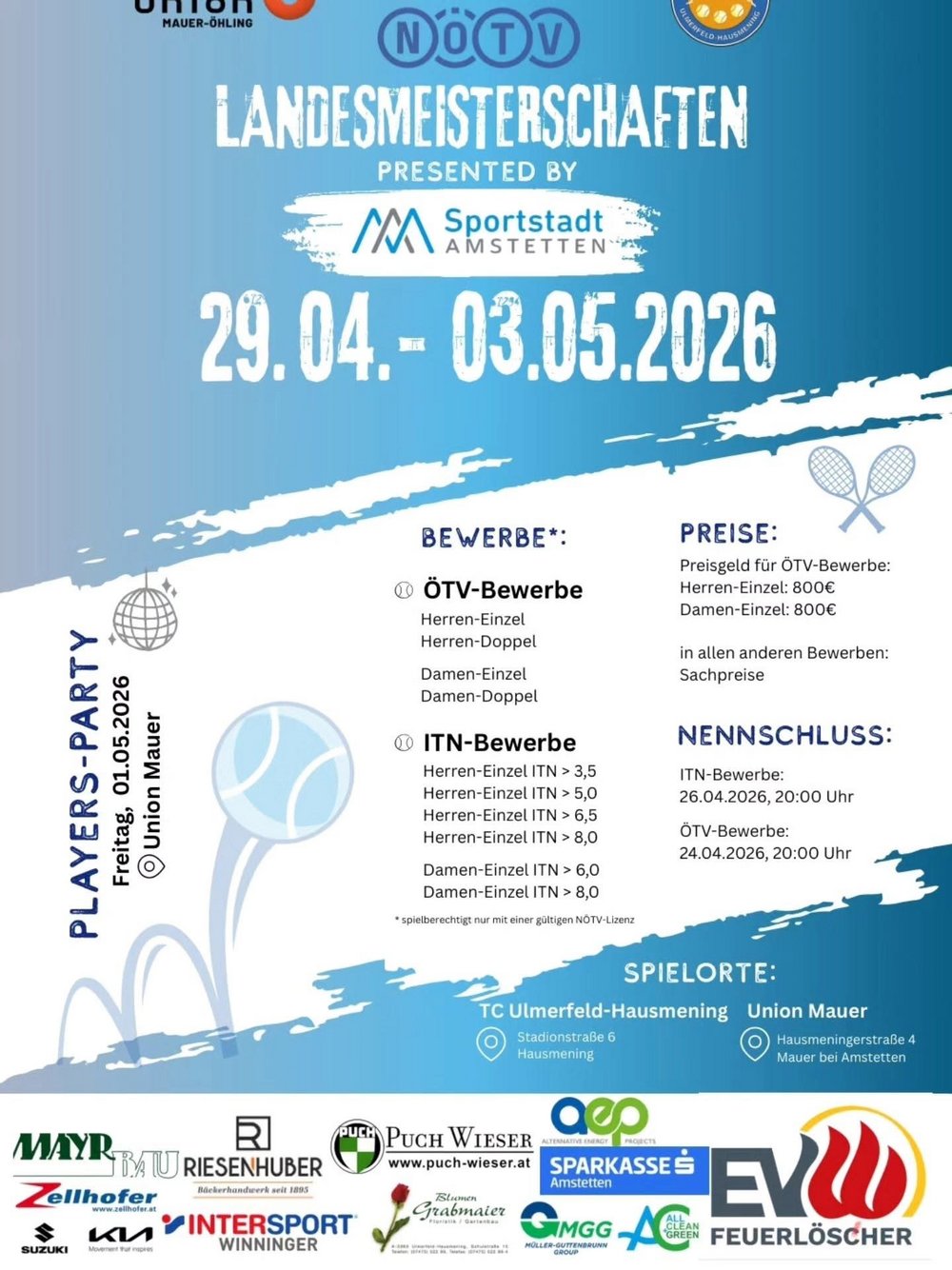 - 29. April - 3. Mai: NÖ Landesmeisterschaften TC Ulmerfeld/Hausmening presented by Sportstat Amstetten (Herren- & Damen-Einzel; Herren- & Damen-Doppel; Herren ITN 3.5, 5, 6.5 & 8; Damen ITN 6 & 8)