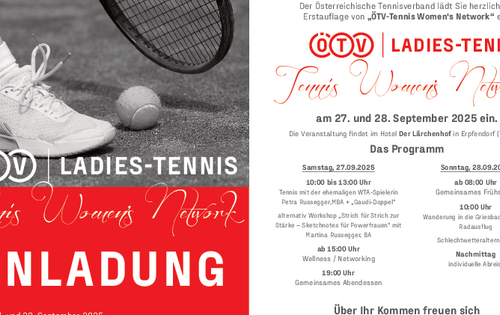 Am 27. und 28. September 2025 lädt der Österreichische Tennisverband zur Erstauflage des Tennis Women’s Network ins Hotel Der Lärchenhof in Erpfendorf (Tirol) ein. Zwei Tage voller Tennis, Inspiration und Networking erwarten die Teilnehmerinnen – ob beim „Gaudi-Doppel“ mit Ex-WTA-Spielerin Petra Russegger oder beim kreativen Sketchnotes-Workshop mit Martina Russegger.