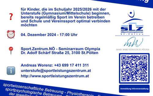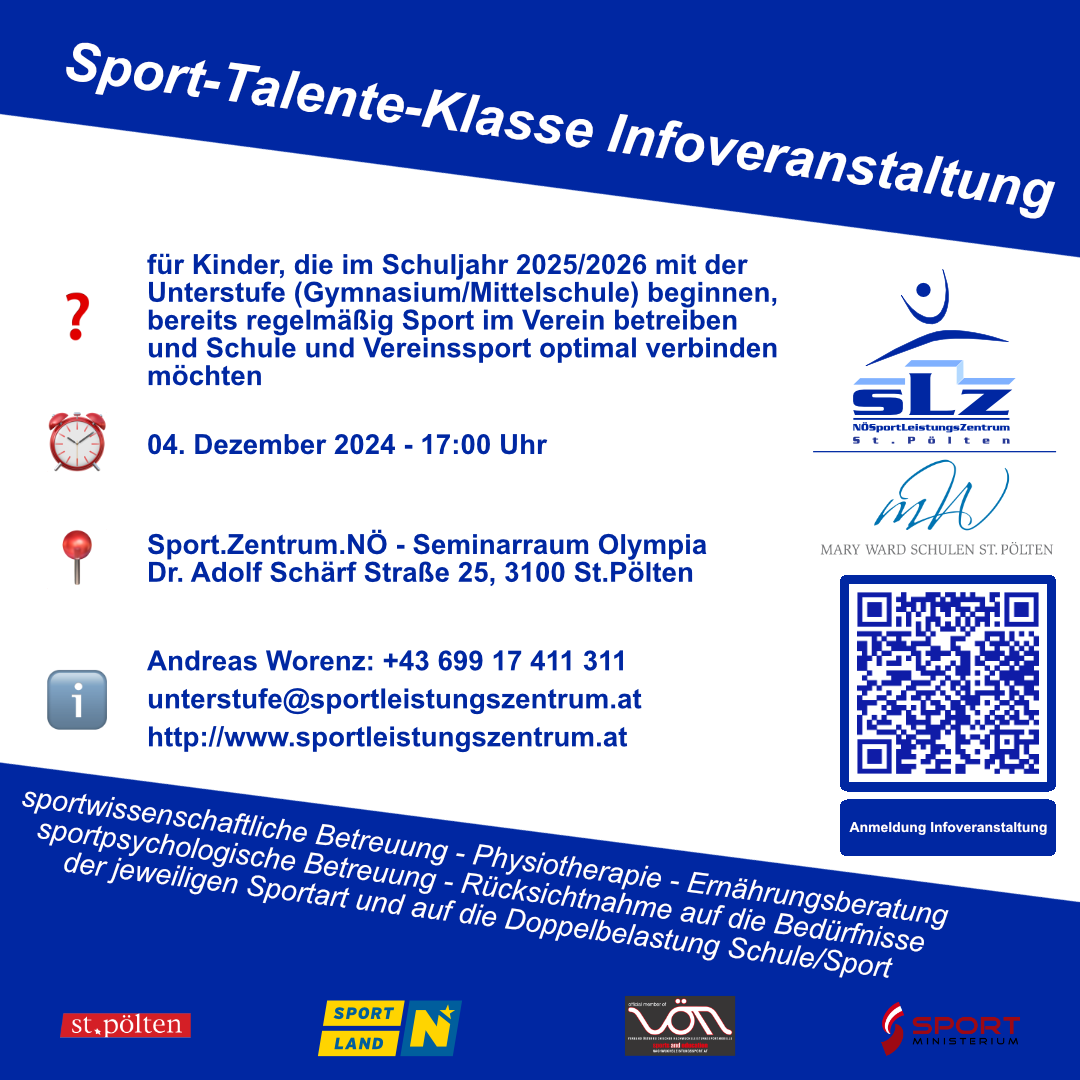 - Andreas Worenz: +43 699 17 411 311, unterstufe@sportleistungszentrum.at, www.sportleistungszentrum.at